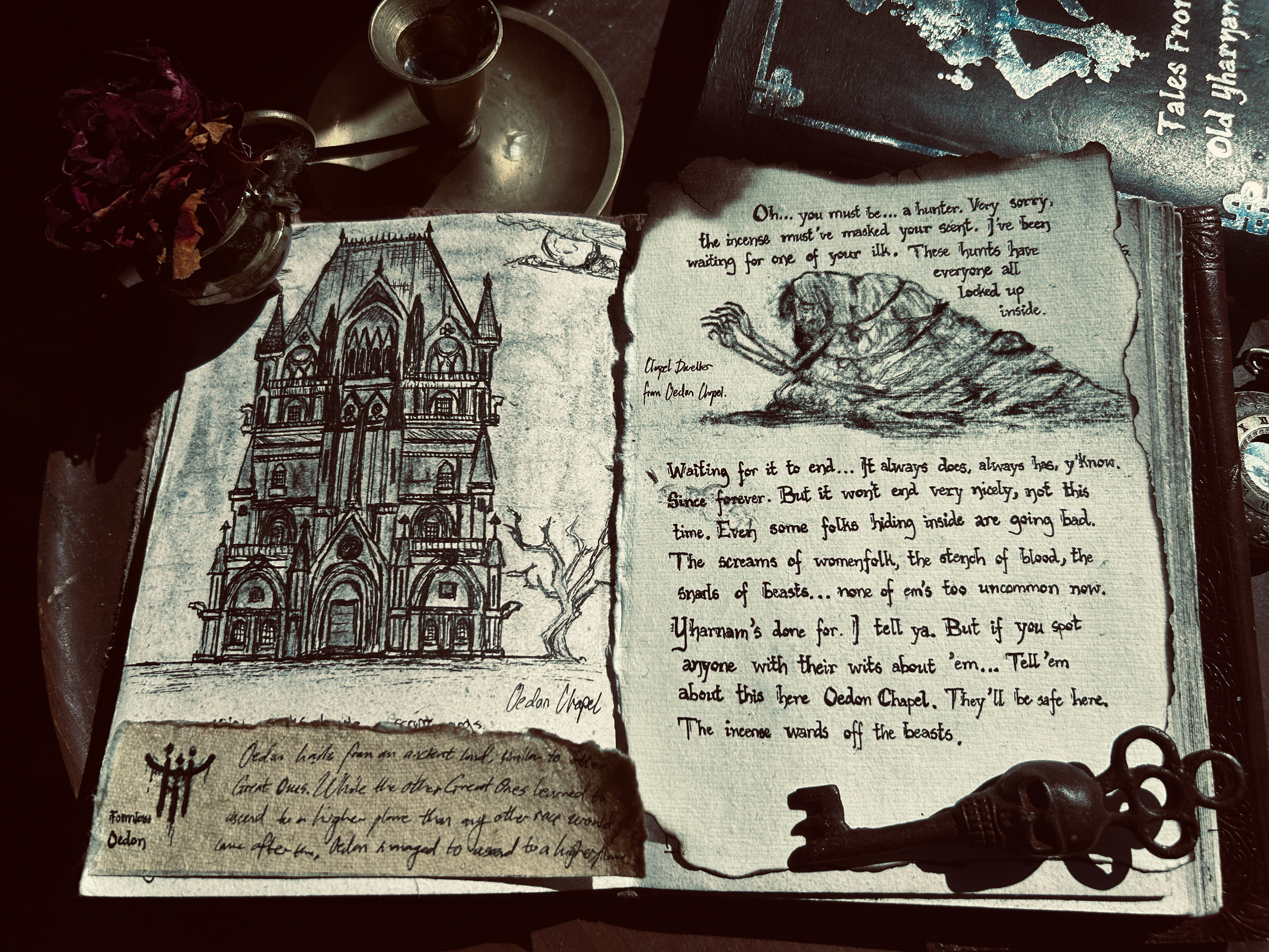 “These hunts have everyone all locked up inside. Waiting for it to end… It always does, always has, y’know. Since forever. But it won’t end very nicely, not this time. Even some folks hiding inside are going’bad. The screams of womenfolk, the stench of blood, the snarls of beasts… none of em’s too uncommon now. Yharnam’s done fer. I tell ya. But if you spot anyone with their wits about ‘em… Tell’em about this here Oedon Chapel. They’ll be safe here. The incense wards of the beasts”