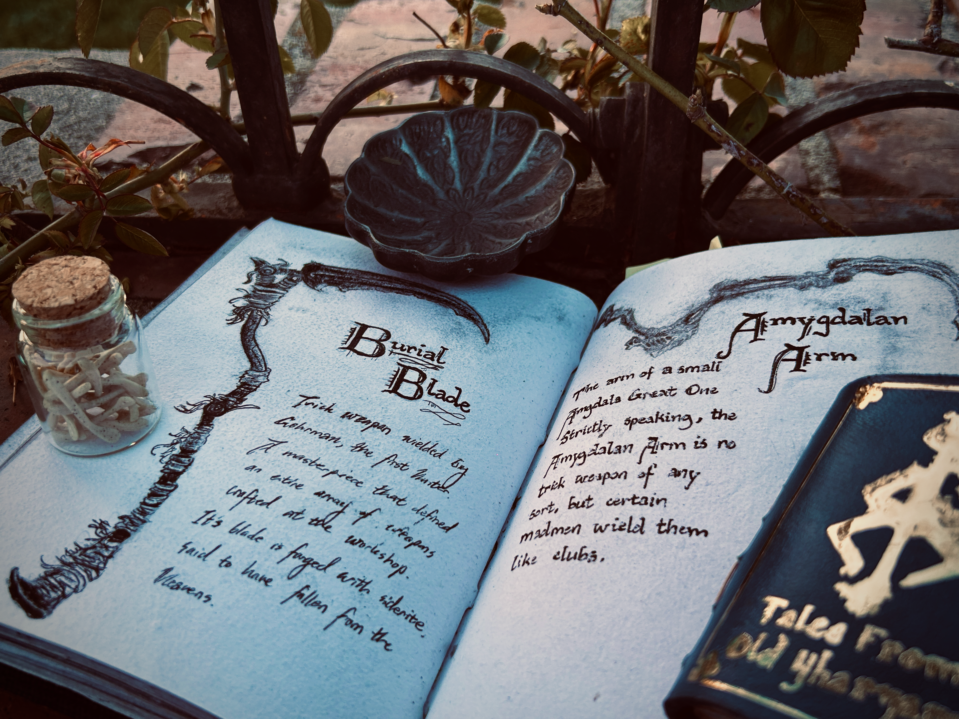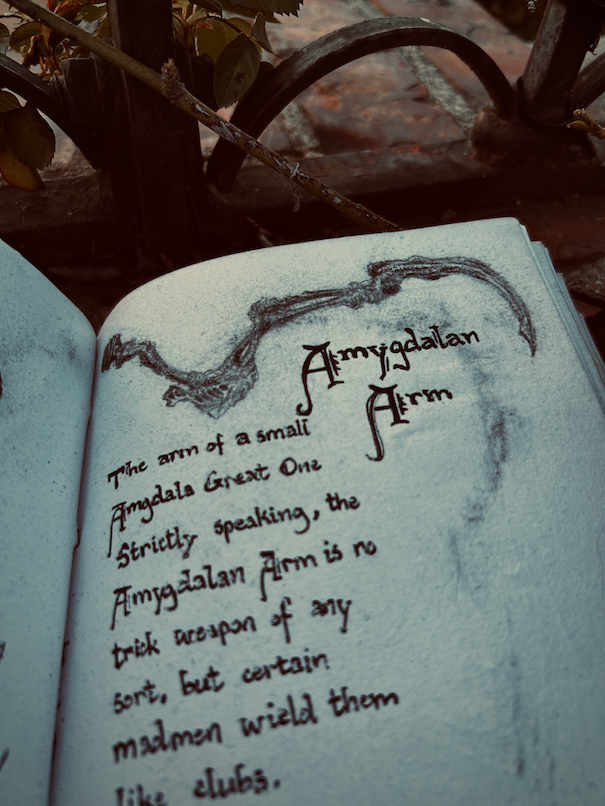 “Strictly speaking, the Amygdalan Arm is no trick weapon of any sort, but certain madmen wield them like clubs. Starts as a large, tough blunt weapon formed of bone, but when extended, the hand quivers as if it were still alive.