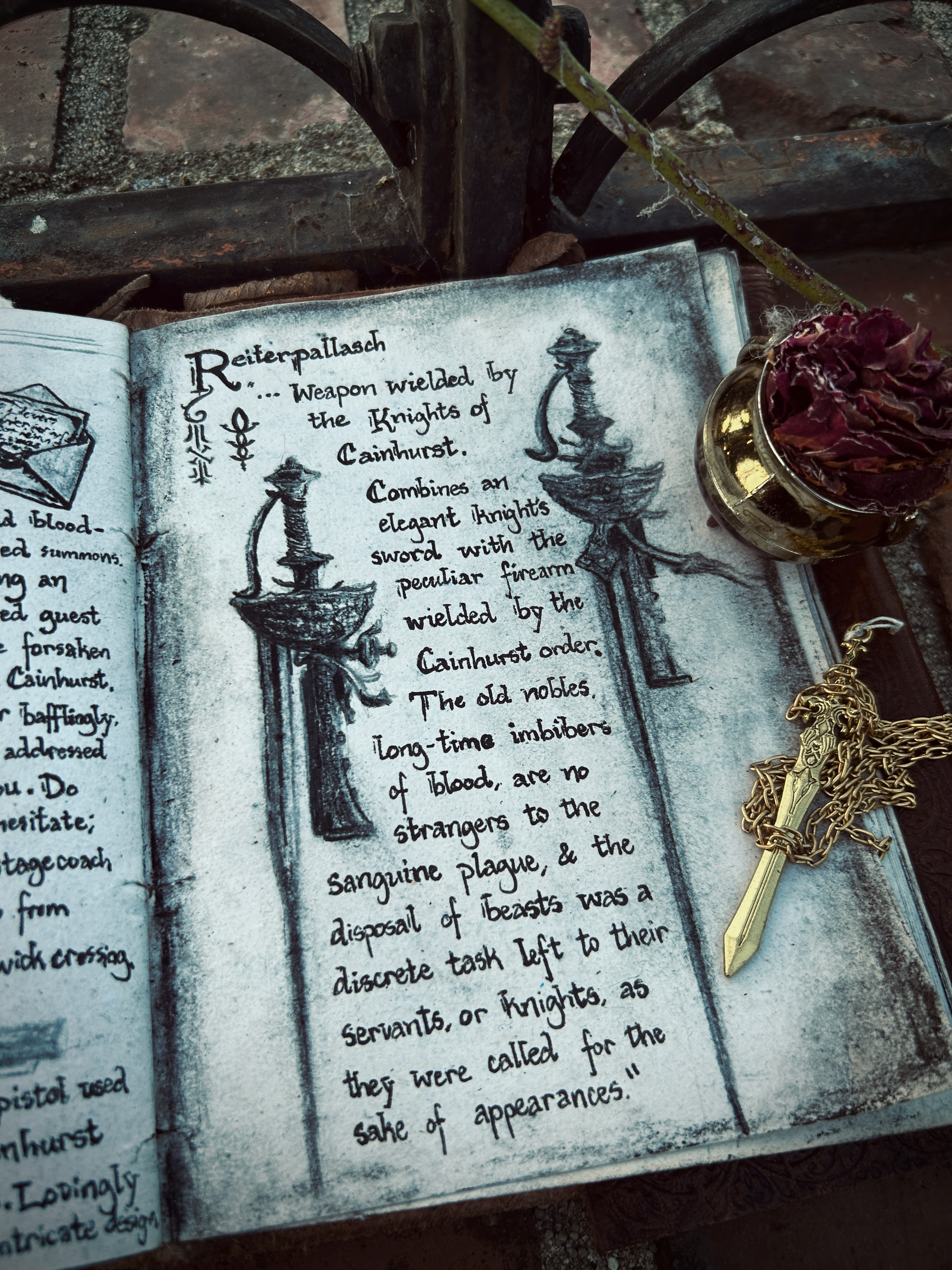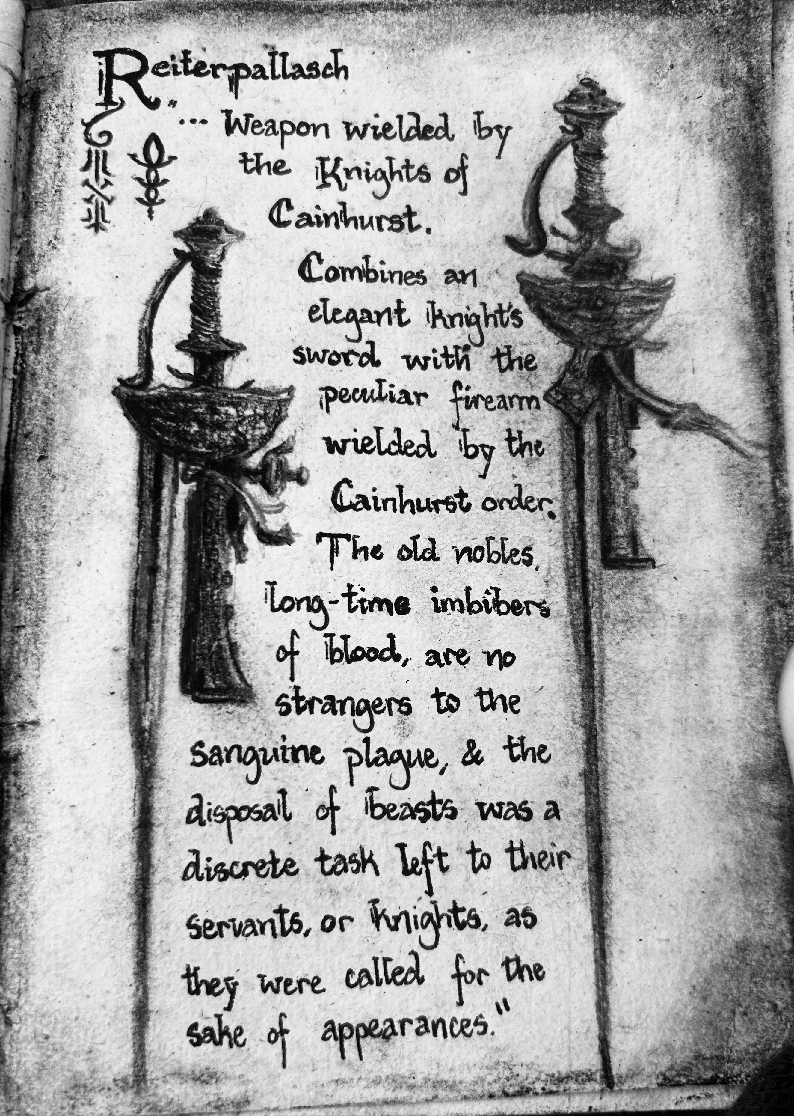 “A weapon of Cainhurst design, combining the elegance of a rapier with the stopping power of a firearm. Those who wield it dance between thrust and shot, wearing down foes with aristocratic precision.”
